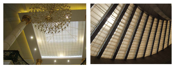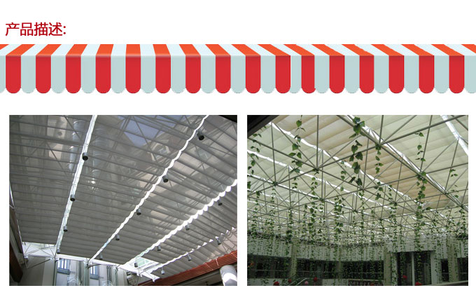 FCS折疊式天棚簾是面料折疊單循環(huán)牽引機構。該系統(tǒng)包括傳動機構、面料和控制系統(tǒng)三個部分,傳動部分的一端為動力端,利用管狀電機旋轉帶動卷管及固定在卷管上的卷繩器旋轉從而使一根鋼絲進行收放。傳動部分的另一端為固定的彈簧滑輪,傳動鋼絲繩通過滑輪進行換向,使一根鋼絲繩的兩端能同時固定在卷繩器上,并且鋼絲繩始終保持繃緊狀態(tài)。當天棚簾機構寬度或長度過大時,可增加引布管或導向系統(tǒng)等輔助裝置。該機構張力小,對面料的要求不高,選擇范圍廣泛。