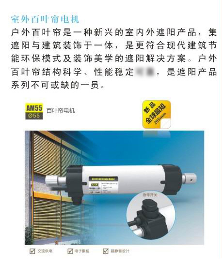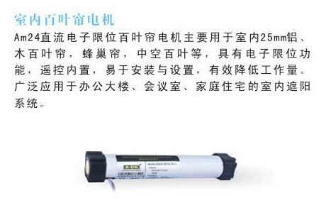 AM24直流電子限位百葉簾電機主要用于室內25mm鋁、木百葉簾,蜂巢簾,中空百葉等,具有電子限位功能,遙控內置,易于安裝與設置,有效降低工作量。廣泛應用于辦公大樓、會議室、家庭住宅的室內遮陽系統。